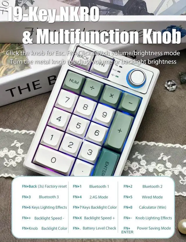 All 19 keys are anti-ghosting and non-conflict. Every keystroke is registered during intense gameplay and fast typing, no matter how many other keys are pressed at the same time. Turn the metal knob to adjust volume, click the knob for Esc. FN+Click the knob to switch to brightness mode, then turn the knob to adjust the backlight brightness.