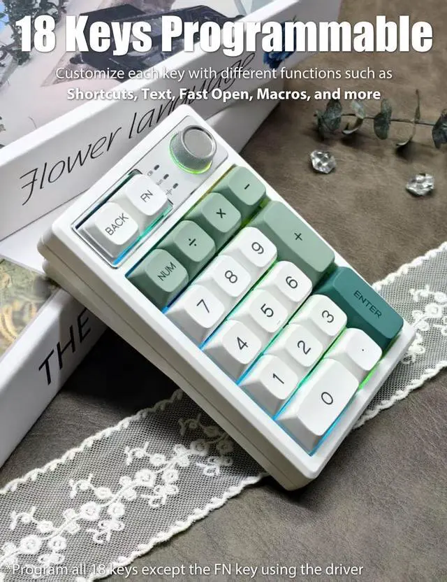 Program all 18 keys except the FN key using the keypad driver. Customize each key with different functions such as system shortcuts, multimedia shortcuts, text input, one-click open for files/folders/web pages, macros, and more. This numpad features memory capability, ensuring settings are retained even after power loss.