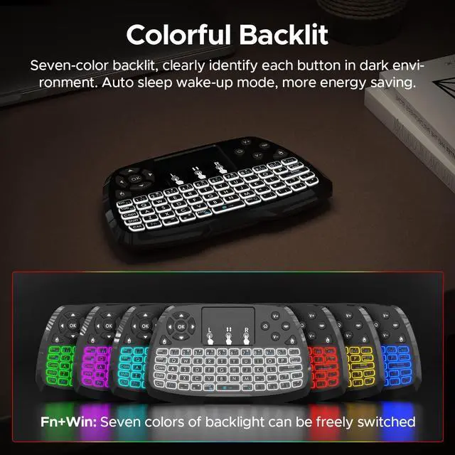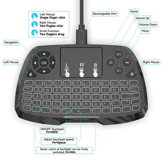 - Multi-function: wireless keyboard + touchpad + mouse + multimedia control keys and PC game control keys.