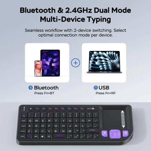 This product is compatible with most Bluetooth-enabled devices, including Windows, macOS, Android phones/tablets, smart TVs, and more.The included USB-A RF transceiver ensures compatibility with low-level environments like BIOS that only support basic USB keyboards