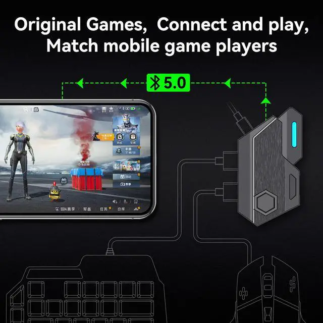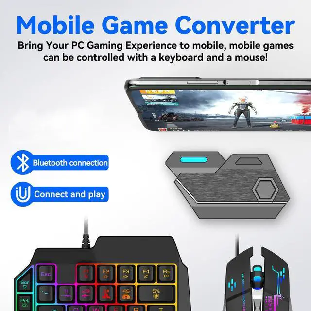 Description: Half hand gaming keyboard and mouse combo is designed for games, the QR code of the converter is used for game connection.