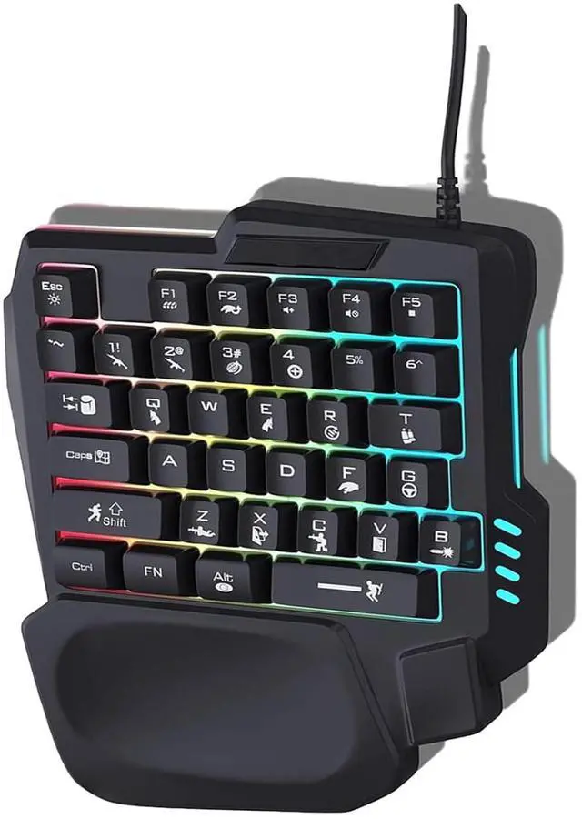 Introducing the ultimate gaming companion - a one-handed gaming keyboard designed for mobile and computer gamers. This compact yet powerful device features a wide palm rest for maximum comfort during extended gaming sessions. With 35 keys and three vibrant backlight colors, you can effortlessly execute commands and navigate through your favorite games with precision and style. The ergonomic design allows you to play comfortably for hours, giving you a competitive edge. Elevate your gaming experience with this versatile and user-friendly keyboard, perfect for both mobile and computer gaming.