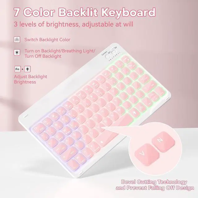 The RGB rainbow backlight keyboard can provide you with a typing experience in the dark, and the backlight has 7 adjustable colors. These colors can be automatically switched in breathing light mode, When you don't need the backlight, you can turn it off.The surface of wireless keyboard uses diamond angle cutting technology to make the keyboard look unique and easy to use.
