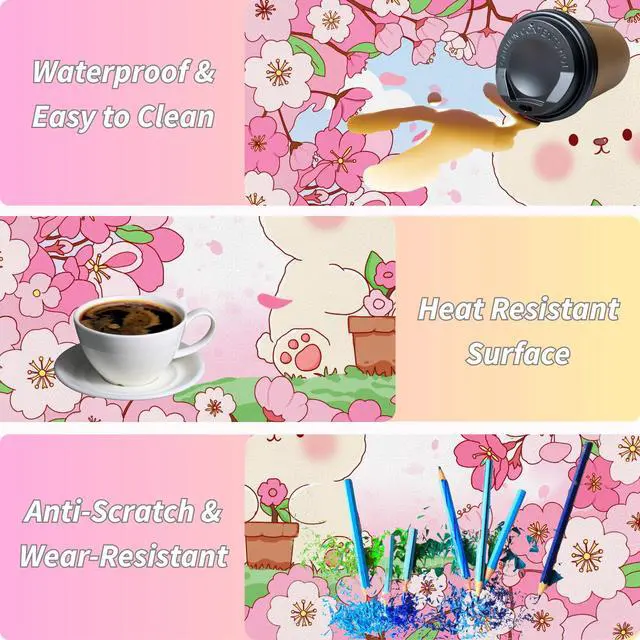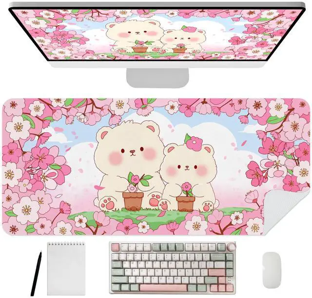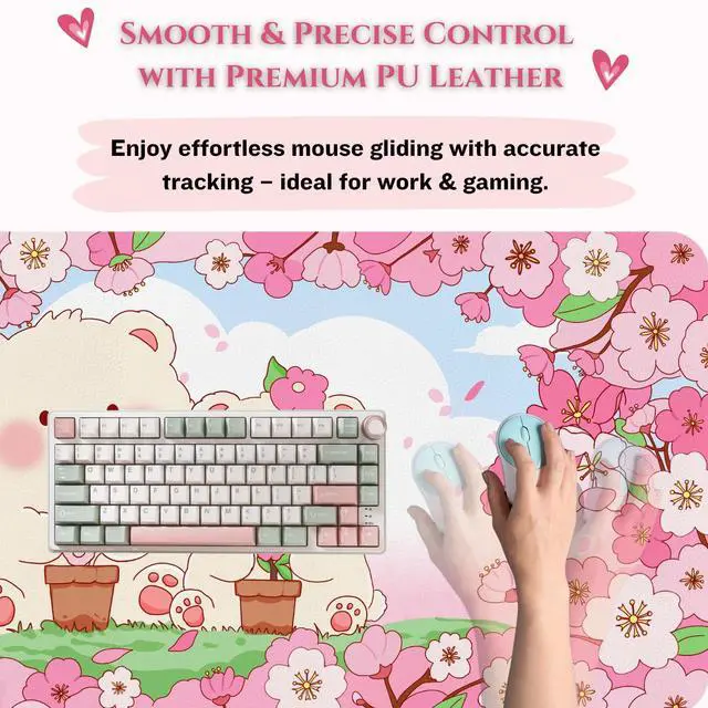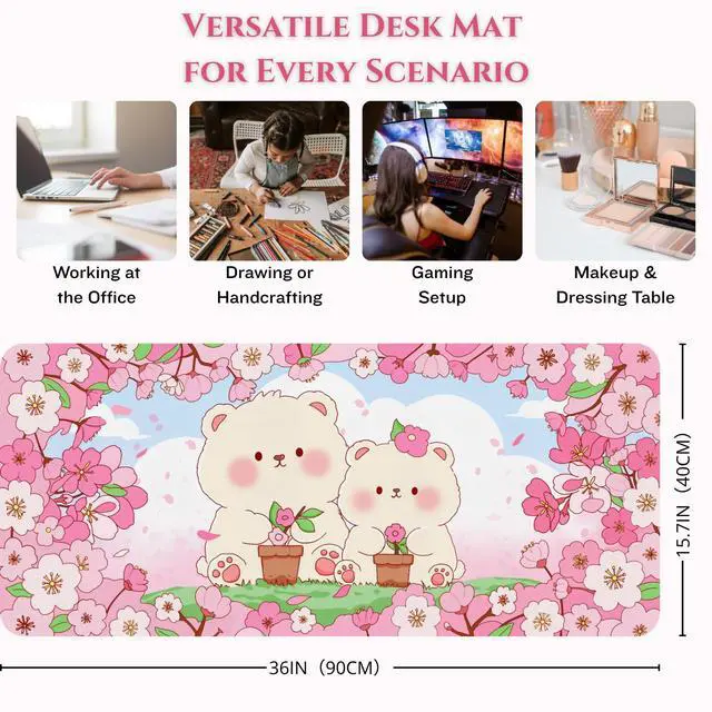 Elevate your workspace with our hot pink mouse pad for deska versatile desk top mat pad and desk mouse pad that doubles as an office mat, seamlessly merging eye-catching style with pro-level performance. Crafted with premium 0.06in PU leather, this computer mouse pad offers a silky smooth glide for computer mouse pads and daily tasks, ensuring pixel-precise tracking whether youre working or gaming. The sturdy textured non-slip base locks it in place, making it a reliable office desk matt for desktop setups and a protective desk protector mat against spills and scratches. Boasting waterproof, heat-resistant, and scratchproof properties, this desktop mat pad wipes clean in seconds while guarding your surface. Choose from a mousepad XL format at 35.4×15.7, a large desk pad measuring 31.5×11.8, or the compact 23.6×11.8 variant. Each size doubles as a computer pad and keyboard mouse pad, combining your keyboard mats for desk and mouse pads for desk into one seamless surface. As a mouse and keyboard pad or desk mat for keyboard and mouse, it also functions as a mouse pad set for women craving a girly desk mat. The standout light pink desk mat features adorable cartoon bears surrounded by delicate cherry blossom prints, delivering a cute mousepad experience and pretty mouse pads for women aesthetic. Plus, it pairs perfectly with your pink computer mouse. Designed as both a practical office mat and a stylish computer mat, this large mousepad doubles as a desk pad pink accent piece and is gift-ready to brighten any setup.