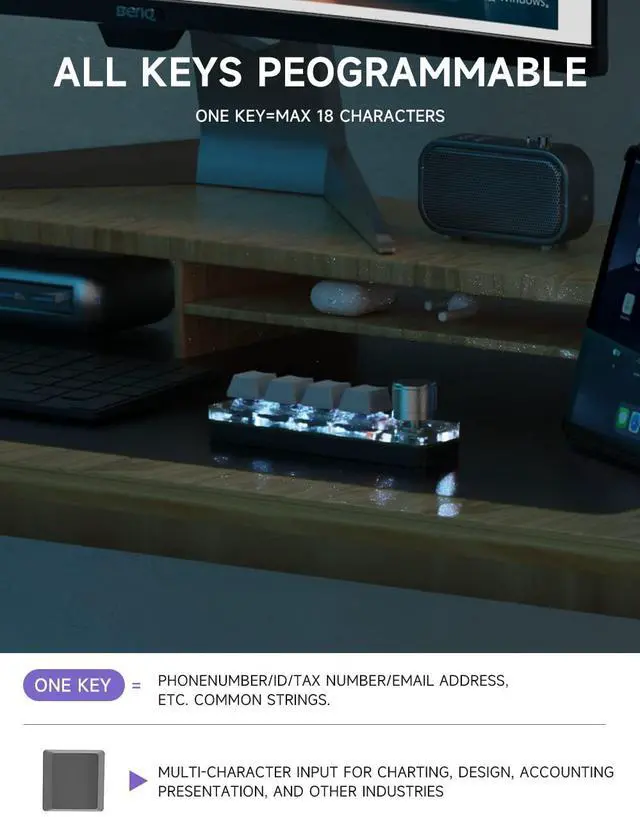 : BIMFORD Macro Keypad's all keys are programmable. Custom programmable key functions include regular 104 buttons, Web navigation buttons, multimedia shortcuts, Scroll Lock, Windows lock, PrtSc SysRq, etc. Each button can be set to any one of these buttons. Unlock infinite possibilities in any industry, casual or professional.