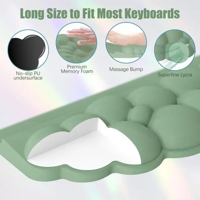 [Fits Most Keyboards - Non-Slip & Easy to Clean] Dimensions:17.3"L x 6"W, The keyboard wrist rest holds most standard regular computer keyboard. The cloud wrist rest measures 17.3"L x 4"W. The non-slip PU base grips desks firmly, preventing sliding. Note: Remove protective film before use