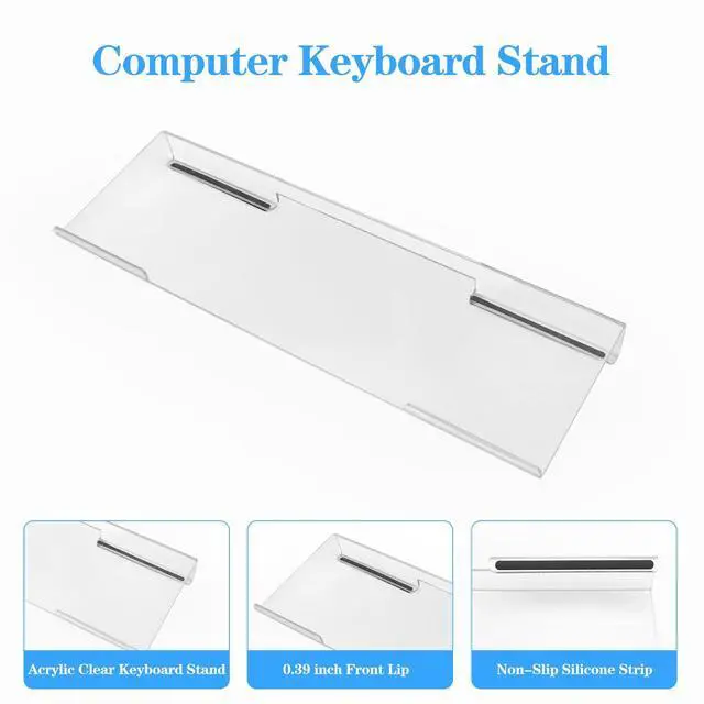 PERFECTLY FITTED KEYBOARD STAND-This computer keyboard stand is made of clear acrylic, sturdy, strong and smooth. The tilted design elevates the keyboard and holds keyboard at a comfortable angle, preventing it from sliding around. The angled design of the tilting keyboard stand improves hand and wrist posture, releasing pressure on elbows and wrists, making typing easier and more comfortable.