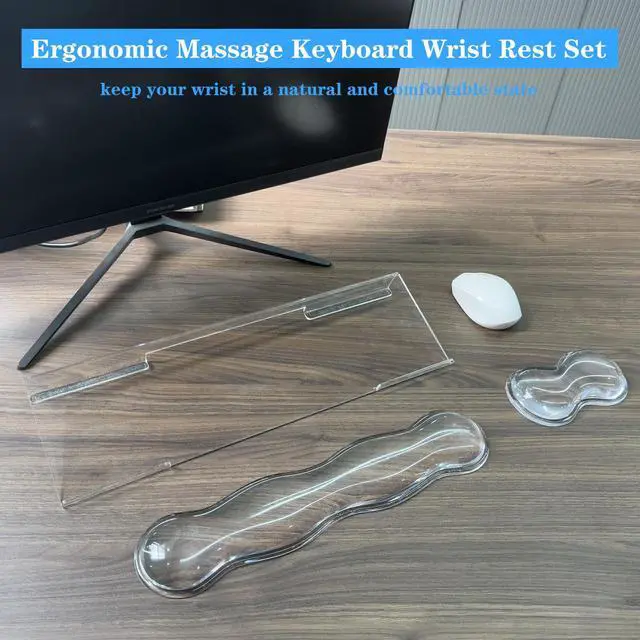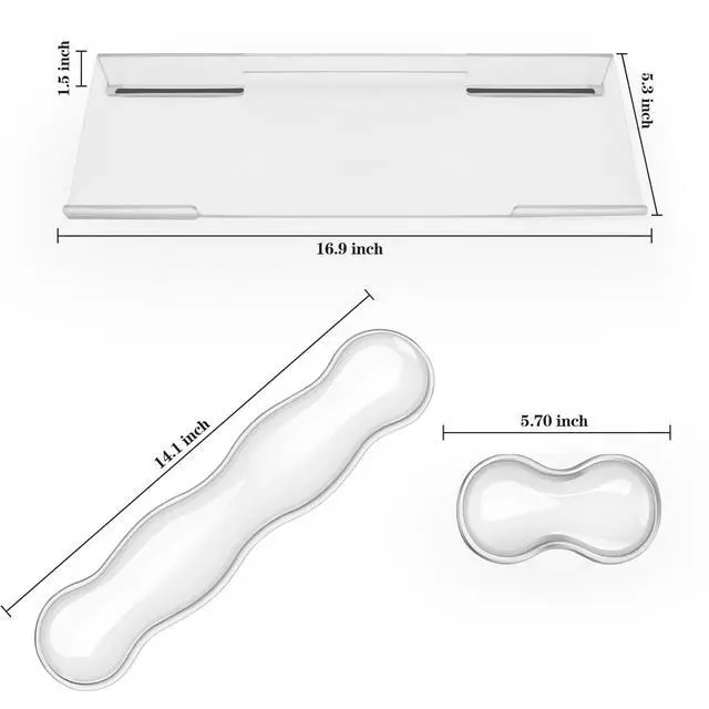 FULLY GEARED FOR YOUR DESKTOP- The 3-in-1 set consists of 3 essential components for office workers, gamers, designers, students, and anyone else who spends a lot of time using a laptop or computer: clear acrylic keyboard stand (16.9 in. x 5.3 inches x 1.5 inch), gel keyboard wrist rest (16.9 in. x 4.33 in. x 1 in.), gel mouse wrist rest (4.72 in. x 2.36 inches x 1 inch). Desktop accessories for PC gaming, desk and homework, handheld stand, large and small keyboard tray that tilts for comfortable typing.