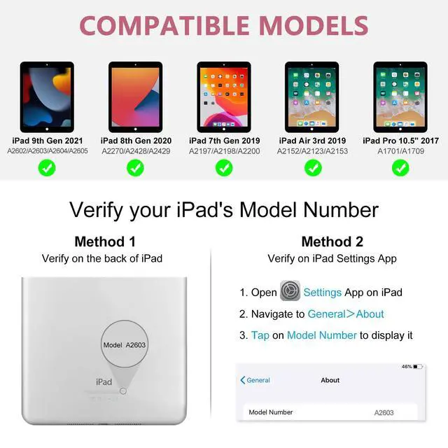 ![]() | Pink | iPad 7 8 9th/iPad Pro/Air 3Gen | A2197/A2198/A2200/A1701/A1709 | Durable TPU leather | 3 different viewing angles | Half year of regular use | 100 mins | |