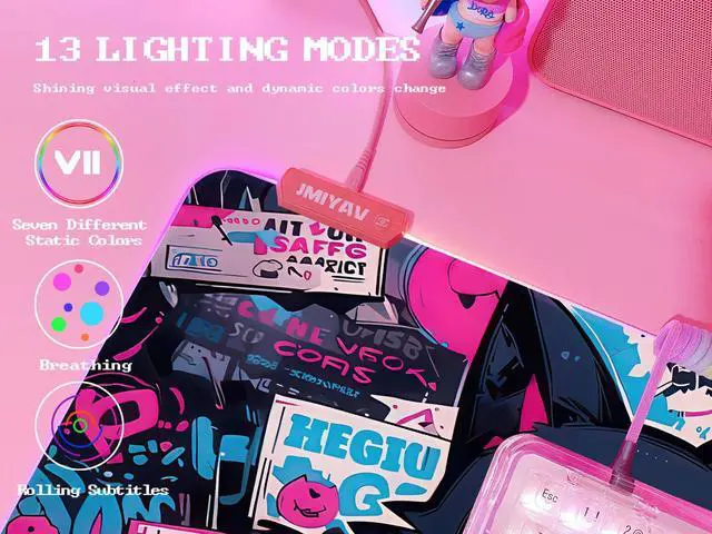13 Lighting Modes Gaming Mouse Pad Super Glow Fiber provides a great RGB back lit effect. You can choose from 13 lighting modes: 9 static light modes and 4 dynamic mode.