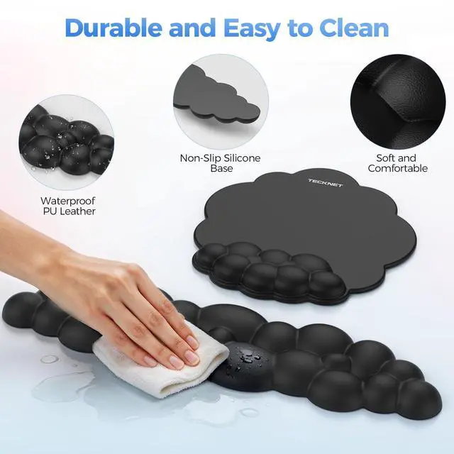Waterproof Surface & Non-Slip BaseThis cloud wrist rest for keyboard and mouse is designed for durability and stability, featuring a durable, waterproof surface that easily withstands spills, moisture, and sweat, making it easy to clean and maintain. The mousepad with wrist rest's non-slip rubber base ensures it stays firmly in place on the desk, preventing it from sliding or shifting during use.