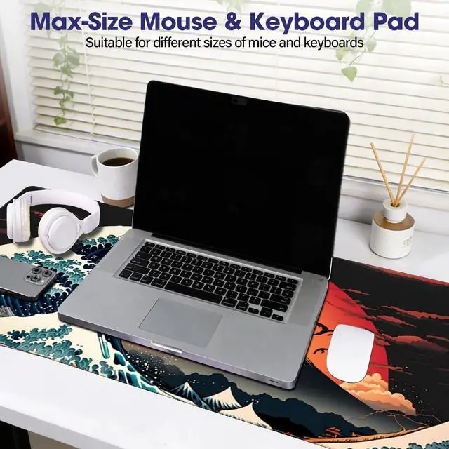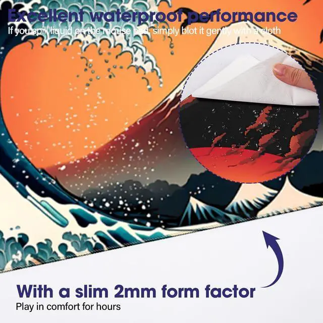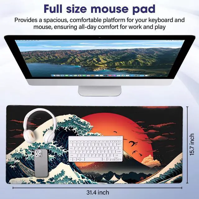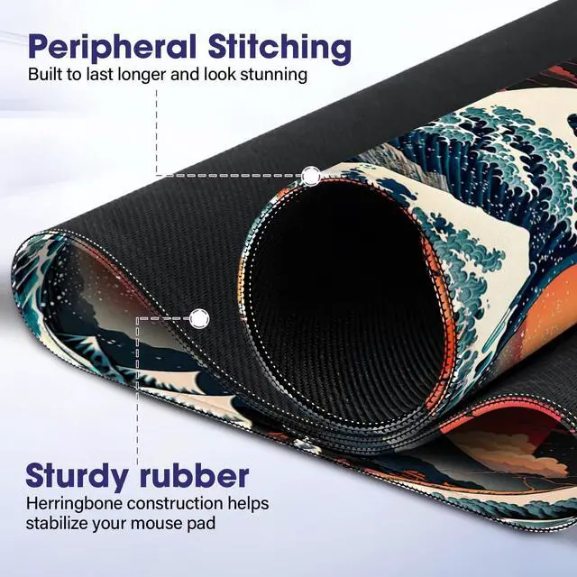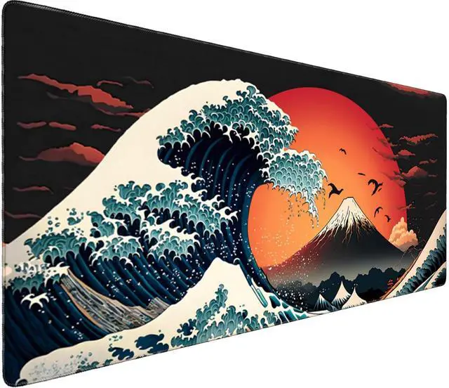 Japanese Sea Wave Large Gaming Mouse Pad 31.5" x 15.7" Full Desk Mat, Non-Slip Rubber Base, Stitched Edges, Waterproof, Durable Surface for Esports, Office, Home