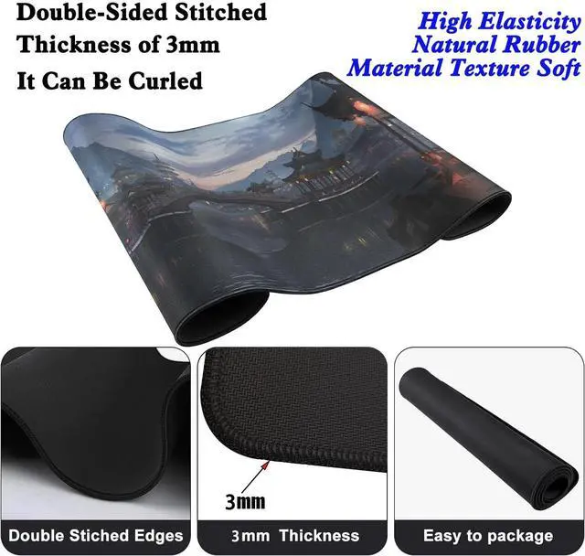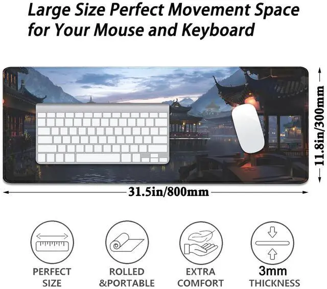This mouse pad measures 31.5 inches in length, 11.8 inches in width, and 0.12 inches in thickness, providing ample space for both mouse movement and keyboard placement.