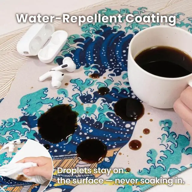 This desk mat features a highly effective water-resistant coating that makes liquid bead up instantly rather than spread across the surface. Droplets stay rounded and move smoothly, so spills can be wiped away with minimal effort. The finish helps protect the printed artwork from moisture and keeps the design looking clear and vibrant with everyday use.