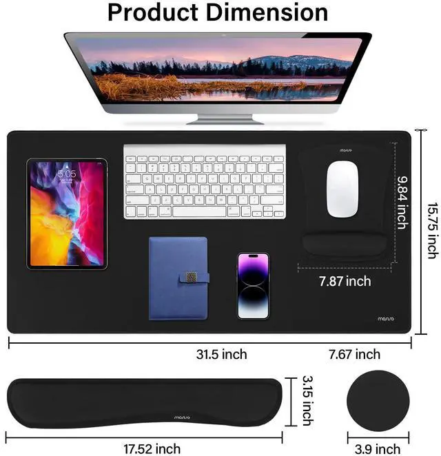 - Dimension of large gaming mouse pad: 31.5 x 15.75 inch; dimension of keyboard wrist rest: 17.52 x 3.15 inch; dimension of mouse wrist rest support: 5.39 x 2.98 inch.