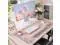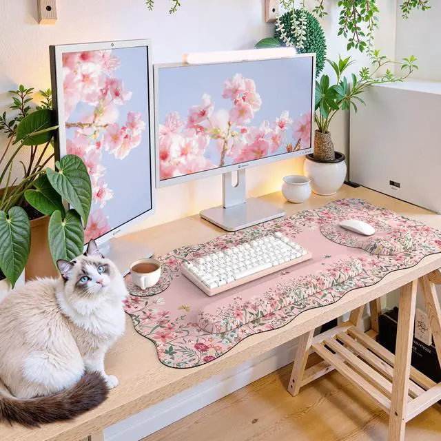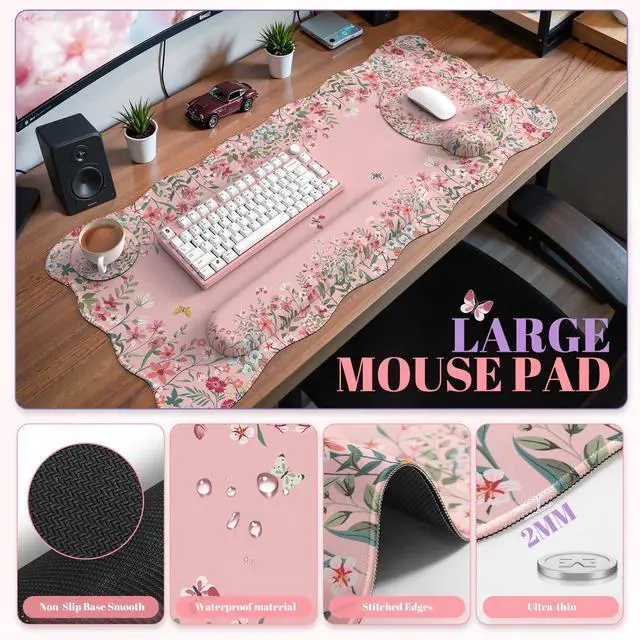 Desk Mat Set,Large Mouse Pad with Wrist Rest,Ergonomic Keyboard Wrist Support for Women,Girly Floral Computer Mat with Scalloped Edges,Non-Slip Desk Pad Home Office Gaming (Pink)
