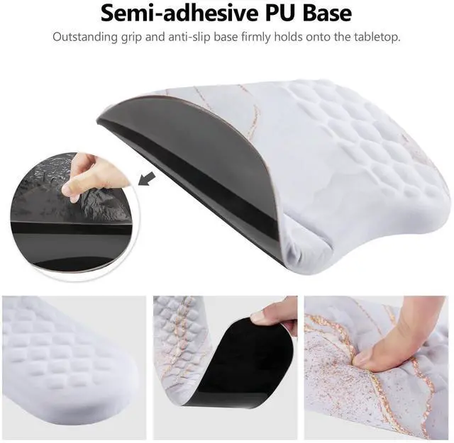 We know how frustrating it can be when your wrist support slips and slides around your desk. That's why our 2-in-1 set comes with an anti-slip PU base that ensures enhanced stability compared to rubber bases. No matter if you're working on a desk, bed, or couch, the pad stays firmly in place, providing you with uninterrupted comfort and support. The edges are specially designed to resist curling, maintaining the product's durability even after prolonged use.
