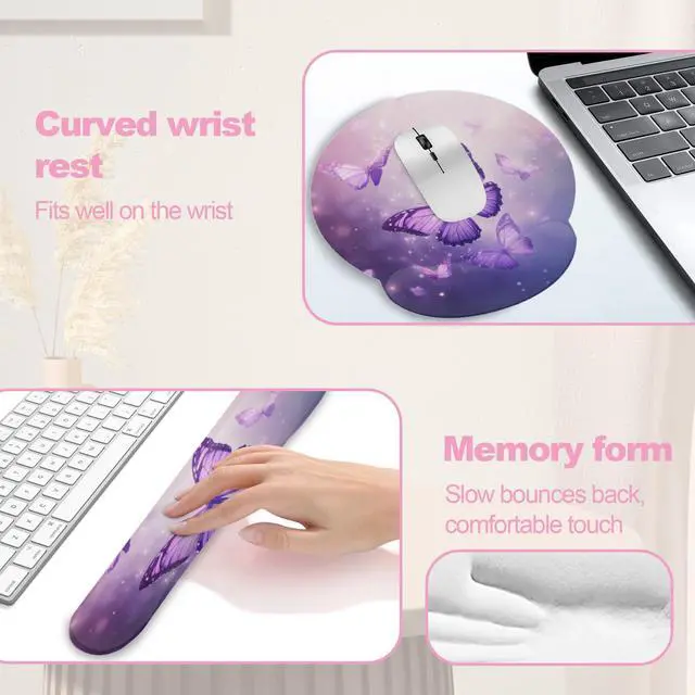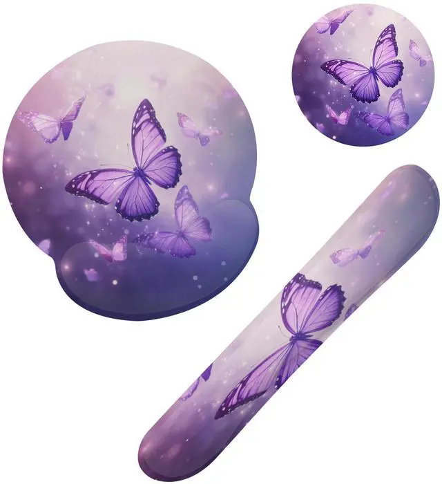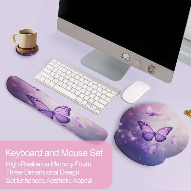 Ergonomic Design: This Butterfly Purple Sparkling mouse pad set features an ergonomic design that conforms to the wrist, providing a comfortable feel and effective support to help prevent repetitive strain injuries. Its angled design keeps the wrist in a neutral position, avoiding excessive bending. This allows the wrist to maintain a natural and comfortable posture.