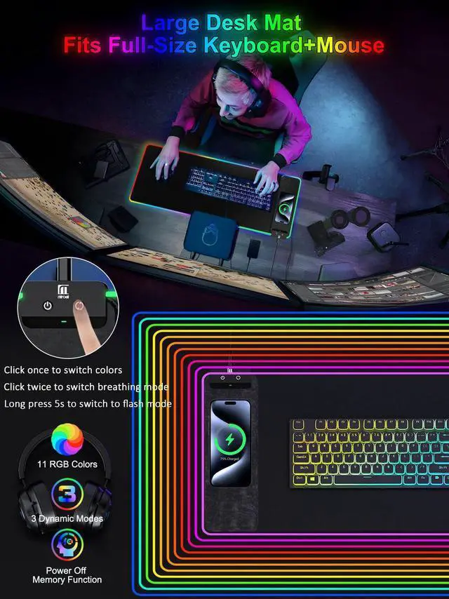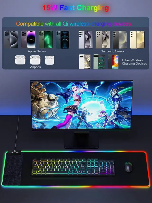 RGB Gaming Mouse Pad with Fast Wireless Charger, LED Extended Desk Mat, Home Office Large Desk Pad with Ultra-Smooth Surface, Non-Slip Base, Waterproof Keyboard Pad (Black)