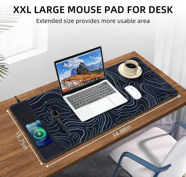 Large Gaming Mouse Pad-The keyboard XLL large mouse pads measures 34.88*15.75 inch(90*40CM) this large mouse pad has enough space to put laptop, mouse, keyboard, no need to move it often like the traditional small mouse mat,can move mouse freely.((Please NOTE: To enjoy fast charging,Need 25W above Fast charging power adapter and a fast charging cable,But power adapter is not included with this Mouse Pad)