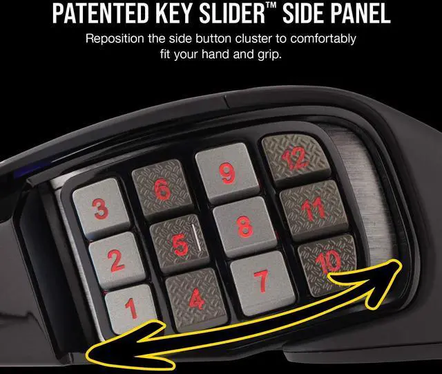 Patented Key Slider control system lets you reposition the side buttons to comfortably fit your hand and grip. 12 side buttons provide instant access to custom macros and button remaps, perfect for MMOs and MOBAs.