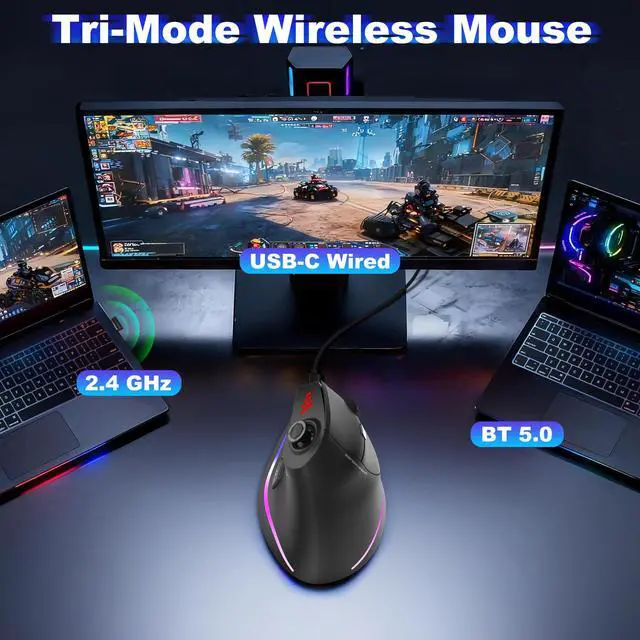 Tri-Mode ConnectivitySupporting BT5.0/2.4Ghz/Wired USB connections, it can connect to 2 devices via BT or 2.4GHz USB Receiver, freely switch between 2 devices with 1 mouse. (Note: You can't control 2 devices at the same time.)
