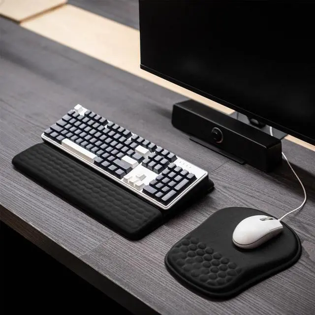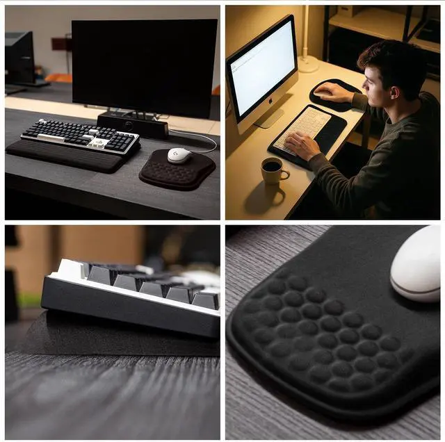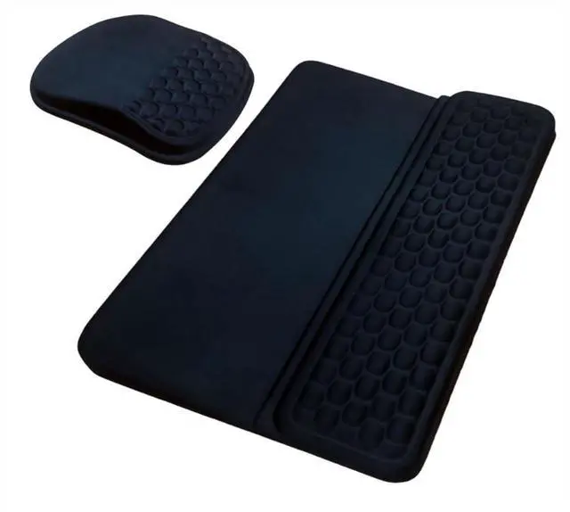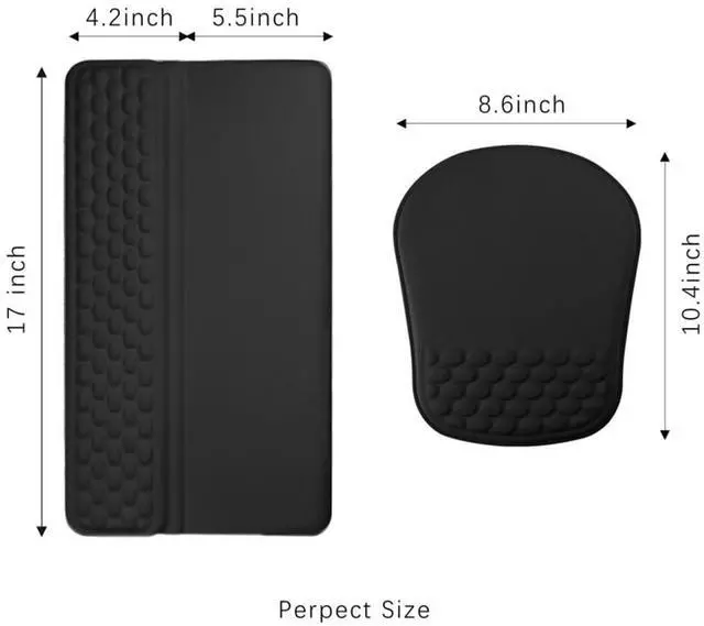 Ergonomic Keyboard and Mouse Mat Set: This set includes an ergonomic keyboard mat (dimensions: 17.0 x 9.7 x 1.2 inches) and an ergonomic mouse mat (dimensions: 10.3 x 8.6 x 1.0 inches), designed to alleviate wrist fatigue caused by prolonged typing or gaming.