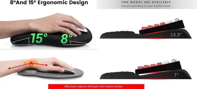 Mouse Pad With Wrist Rest: Our mouse pad features a textured design that eases wrist pressure, enhances airflow, and prevents sweating. The 8/15° incline supports your wrist optimally, ensuring maximum comfort during use.