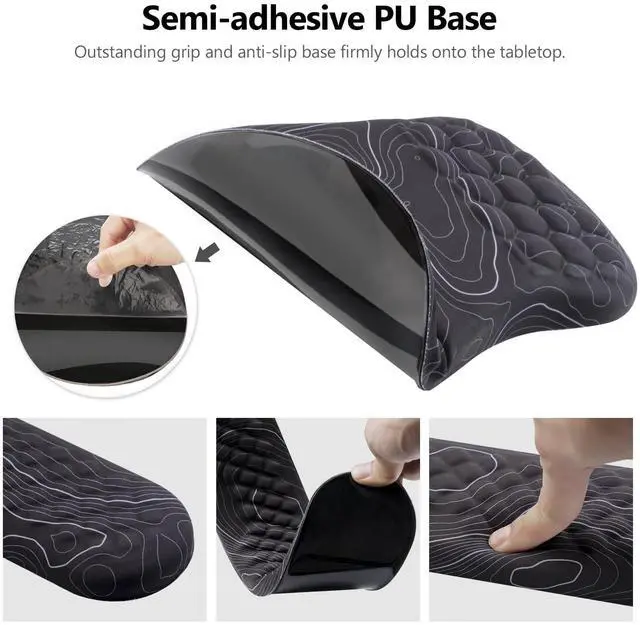 We know how frustrating it can be when your wrist support slips and slides around your desk. That's why our 2-in-1 set comes with an anti-slip PU base that ensures enhanced stability compared to rubber bases. No matter if you're working on a desk, bed, or couch, the pad stays firmly in place, providing you with uninterrupted comfort and support. The edges are specially designed to resist curling, maintaining the product's durability even after prolonged use.