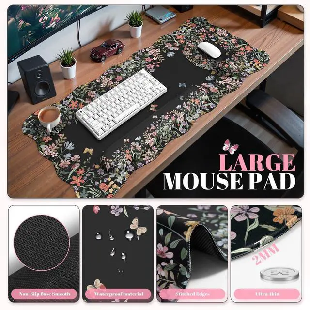 Desk Mat Set, Large Mouse Pad with Wrist Rest, Ergonomic Keyboard Wrist Support for Women, Girly Floral Computer Mat with Scalloped Edges, Non-Slip Desk Pad Home Office Gaming (Black)