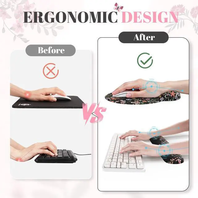• Ergonomic Design: The ergonomic mouse pad with wrist rest fits the wrist, the keyboard wrist rest and mouse wrist rest can provide a good touch and effective support for your wrist, keeping your wrist and hand relaxed