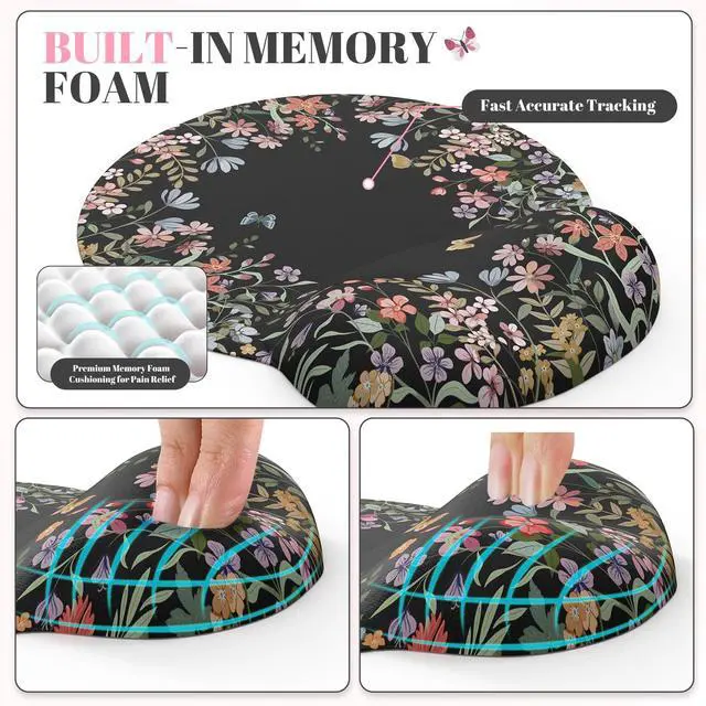 Desk Mat Set,Large Mouse Pad with Wrist Rest,Ergonomic Keyboard Wrist Support for Women,Girly Floral Computer Mat with Scalloped Edges,Non-Slip Desk Pad Home Office Gaming (Black)