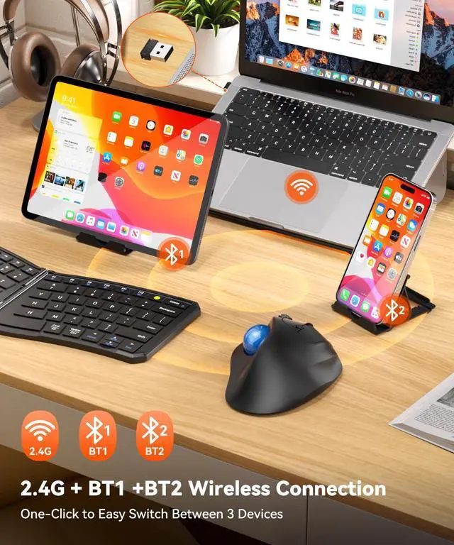 [3 Devices Connection - BT1+BT2+2.4G] - 33 feet / 10 meter wireless connection range.This wireless mouse connects via Bluetooth or the included 2.4G USB receiver, Supported by an Easy-Switch button.No need to re-pair for a seamless workflow. Compatible with PC, Mac, laptops, tablets and so on.