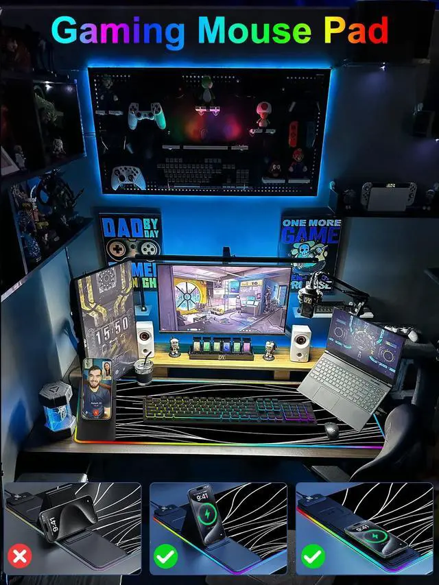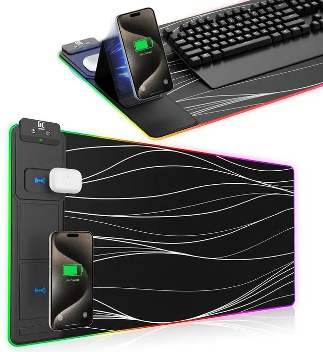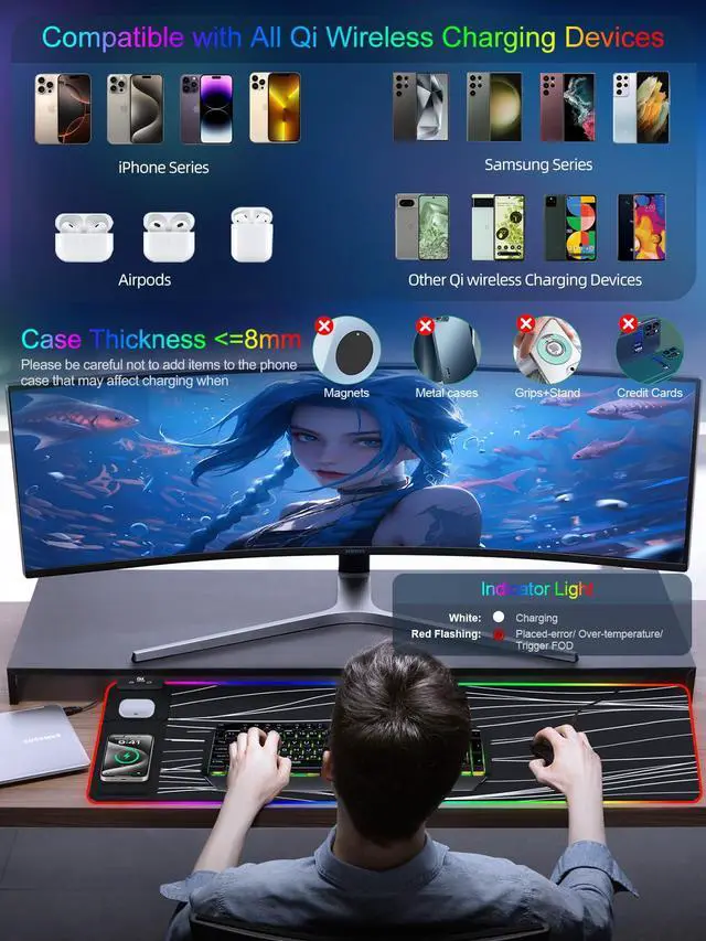 Fast Charging Mouse Pad with Phone HolderGaming Mouse Pad has built-in 15W fast wireless charging function, which can conveniently charge your compatible devices without extra cables interfering with your desktop. Desk Mat compatible with iPhone 15/14/13/12/11/X/XR/XS/8 series; Samsung Galaxy S23/S22/S21/S20/S10/S9/S8/Note 9/8; Airpods 3rd/Airpods Pro 2nd/Airpods Pro and other Qi enabled devices. (Note: 15W need power adapter 9V 3A, and power adapter is not included with this Mousepad)