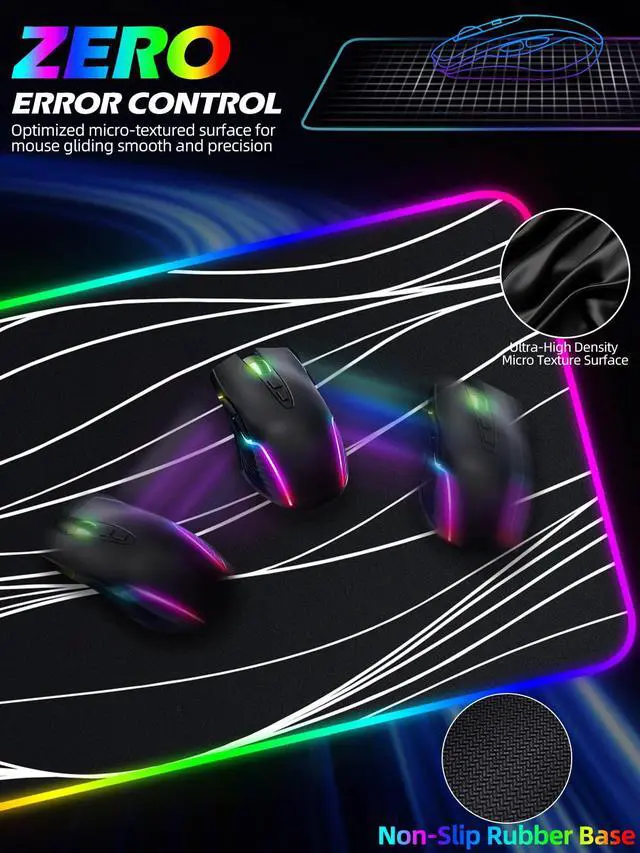 Desk Mat with 11 RGB Lighting ModesLED Mouse Pad designed with 11 different lighting modes - 2 dynamic modes and 11 static lighting modes; RGB Gaming Mouse Pad allows you to personalize your gaming setup. Choose your favorite color to create a visually stunning gaming experience. The power-off memory function can remember your last light mode choice. Awesome Cool Gaming Mousepad.