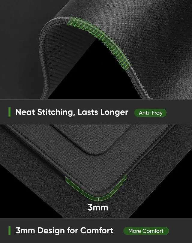 3mm thickness provides comfortable wrist support and proper height. Lock-stitched edges for durability and to prevent fraying. Full non-slip natural rubber backing lays flat and resists curling.