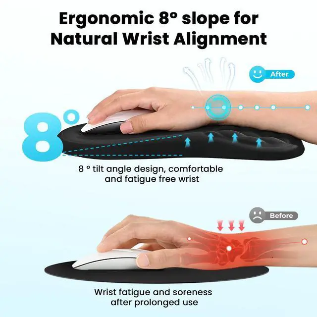 Ergonomic 8° Massage Wrist SupportFeatures an 8° ergonomic slope with honeycomb massage surface to reduce wrist pressure, relieve fatigue and soreness, and help prevent carpal tunnel discomfort. It keeps your wrist naturally aligned for all-day comfort during work and gaming.