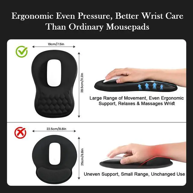 Soft Memory Foam & Massage DesignFilled with slow-rebound memory foam that retains its shape and provides plush support. The raised massage texture improves air circulation, keeping your wrist cool and dry without sweat buildup even during long hours.