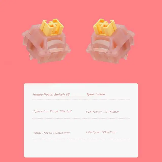 Introducing the Outemu Honey Peach Switch V3 Linear mechanical keyboard switch, engineered for superior typing performance. These switches feature a smooth linear action with a precisely calibrated 50gf operating force and specialized silencing strips for whisper-quiet operation. The switch offers a generous 3.0mm total travel distance with 1.5mm pre-travel, delivering responsive keystroke feedback while maintaining comfort during extended typing sessions. Built to last with a 50-million keystroke lifespan, these switches incorporate quality components including a POM stem, PC housing, and precision spring. The 5-pin design ensures stable mounting and consistent performance. Each switch is thoughtfully designed with light guide pillars and a moving film mechanism for smooth operation. Perfect for both gaming and professional typing applications, these switches provide the ideal balance of tactile response and quiet operation.
