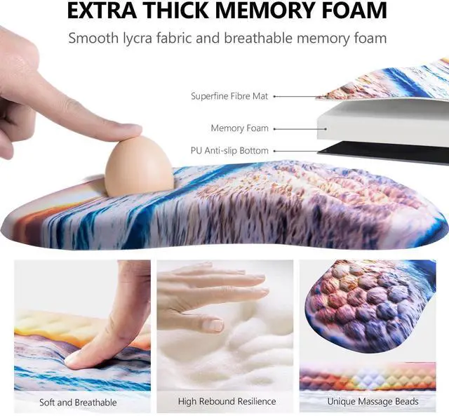 we take comfort to the next level with our Massage Design. Our desk mouse pad and keyboard wrist rest feature a unique bumpy massage bead design. This innovative feature promotes healthy blood flow and improves air circulation around your wrists, preventing discomfort during those long work sessions or intense gaming marathons. Experience a superior level of comfort that ordinary flat wrist supports simply can't match.