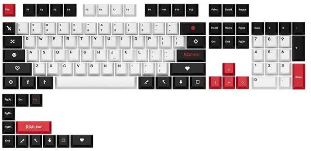 Featuring an original black, white and red themed keycap set inspired by early dungeon crawler and sidescroller games of the 90's. This keycap set featured unique artwork across the keycaps and was designed to be compatible with most keyboard layouts.