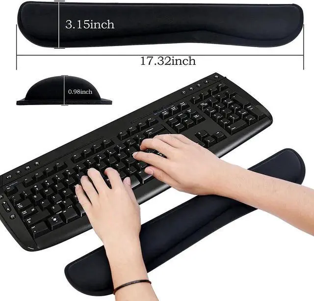 Made of Comfortable Memory Foam and soft & Smooth & Breathable Material to the pads, supply Lightweight, Comfortable, Durable and Ergonomic touch, slow bounces back and not easy to out of shape and Ideal for Longer Hours of Use Non-skid Rubber base provides heavy grip preventing sliding or unwanted movement for Keyboard and mouse pads, Double Sticking and Press handing for edge to supply flat and smooth edge and will not roll up nor split open; 17.3 *3*1 inch keyboard wrist pad and 5.5 * 2.75 *1 inch mouse wrist pad fits most computers or notebooks, improve hand and wrist posture, avoid joint and wrist problems and release your elbows and shoulder stress for long hours of use on the computer; Mouse wrist rest designed with groove fits your hand better; Deformation free keyboard pad, stands still while typing, Relaxing and comfortable use such as home, office, cybercafe, etc.