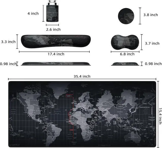 Desk Mat SetLarge desk pad 35.4 x 15.7 x 0.04 in mouse pad wrist rest 5.12 x 2.76 x 0.98 in keyboard wrist rest pad 17.7 x 3.4 x 0.98 in coaster 3.8 x 3.8 in can cooler sleeves 3.7 x 4 in. This large desk mat is large enough to fit your mouse gaming keyboard and other desktop items providing plenty of space for professional gaming or office work. The 5 in 1 set design enhances the quality of life and happinessHigh Quality MaterialsThe mouse pad designed with memory foam and soft smooth material the mousepad rebound slowly and are not easy to out of shape.