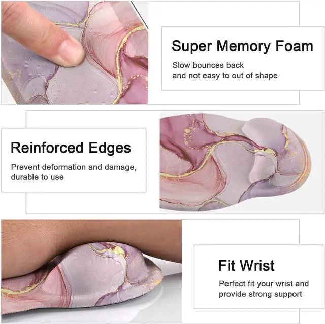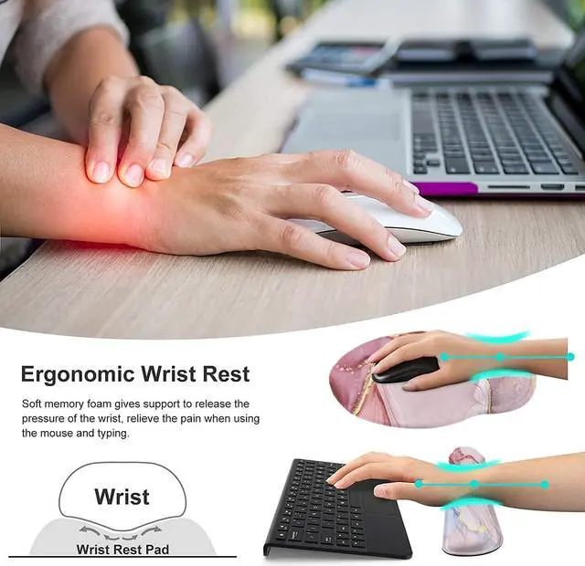 Ergonomic DesignLateefah mouse pad with wrist rest is contoured ergonomically to keep the wrist well supported for higher while working and gaming for long periods of time. The keyboard wrist rest provides soft support to reduce stress fatigue and pain in the wrist. Perfect wrist & hand fatigue reliever for workers gamers writers editors who are engaged at long typing workLightweight & Soft & DurableThis keyboard wrist rest and mouse pad made of soft Lycra fabric and interior spongy memory foam elastic material to supply Lightweight Comfortable Durable and Ergonomic touch slow bounces back and not easy to out of shape and Ideal for Longer Hours of Use prevent your wrist from injuryAnti-slip Rubber BaseThe backside of this mouse pad with wrist rest is thickened with textured rubber material which provides heavy grip preventing sliding or unwanted movement for keyboard and mouse pads when typing.