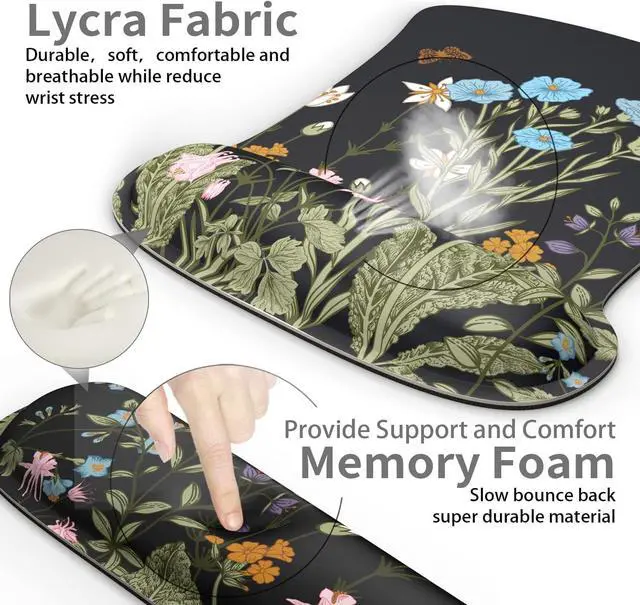 ? [Ergonomic Design]The ergonomic silhouette is designed to fit the wrist perfectly. Provides soft support to reduce stress fatigue and pain in the wrist. The height of the wrist rest is the same as that of the wrist when using the keyboard or mouse so that the wrist is well supported during long hours of work and gaming. Effectively avoid wrist injury caused by wrist friction with the desktop.? [Memory Foam Wrist Support]The keyboard wrist rest and mouse pad are made of memory foam. The keyboard wrist rest is stable and easy to deform in long-term use.