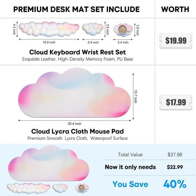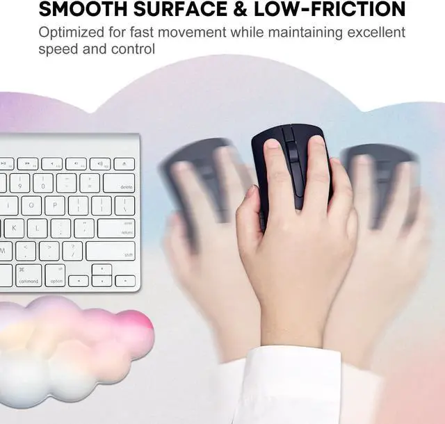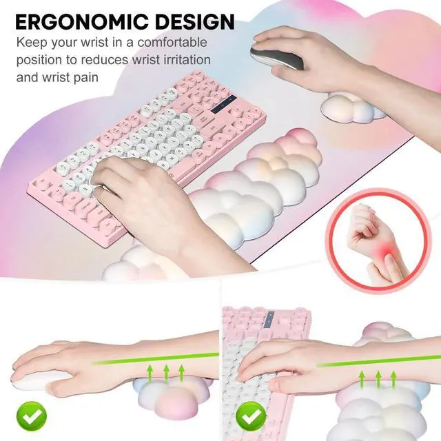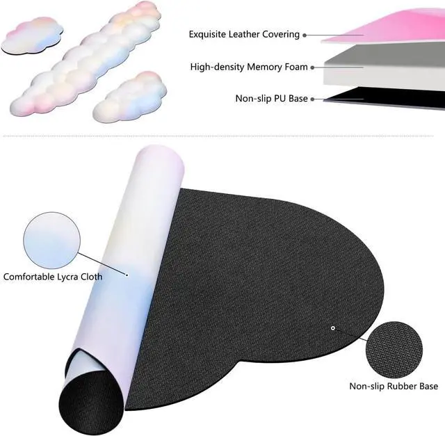 ? Rainbow Color JIKIOU Rainbow Color draws its unique design inspiration from Rainbow in the sky symbolizing good luck. JIKIOU hopes bring good luck and happiness to every customer? 4-in-1 Cloud Wrist Rest SetIncluded 1pcs XXL cloud mouse pad measures 35.4 x 15.7 inches for providing ample room to fit your gaming mouse full-size mechanical keyboard and other desk items 1pcs cloud keyboard wrist rest for keyboard 1pcs cloud mouse wrist rest pad for mouse 1pcs cloud cup pad for cup? Ultra-smooth Surface XXL Cloud Mouse Pad is made of Premium-textured and smooth cloth surface that the mouse glides over nicely it is optimized for fast movement while maintaining excellent speed and control great for daily work or gaming? Savior of Wrist PainThe comfortable memory foam-filled cushion and ergonomic structure conform to your wrist for maximum comfort and support it reduces wrist irritation and wrist pain helps treat and prevent carpal tunnel syndrome? Anti-slip Rubber BaseDense anti-slip rubber base provides heavy grip preventing sliding or movement of mouse pads available for any flat hard tabletop surface.