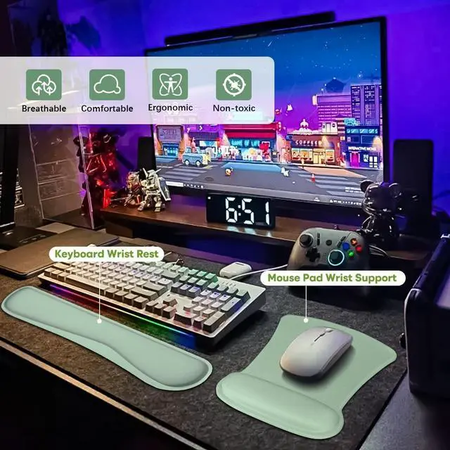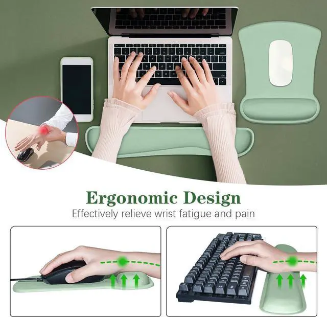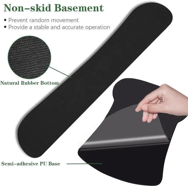 Ergonomic DesignThe curved design of these two wrist rests fits perfectly on the wrist. Keep wrists at the proper posture for wrist health effectively relieve wrist fatigue and painComfortable SupportMouse pad is gel-filled and keyboard pad is memory foam-filled soft and lightweight with great elastic and slow rebound and not easily deformed for long-term useNon-slip BaseKeyboard pad with non-slip natural rubber base and unique texture to provide stable operation; and the PU bottom of the mouse pad has strong adsorption power to prevent random movementBreathable Smooth SurfaceMade of premium fabric surface to offer smooth and accurate mouse control super soft and comfortable touch is suitable for players office workers writers editors designers and students2 in 1 Wrist Rest SetGreat value and time saver sets ideal for daily life and work.