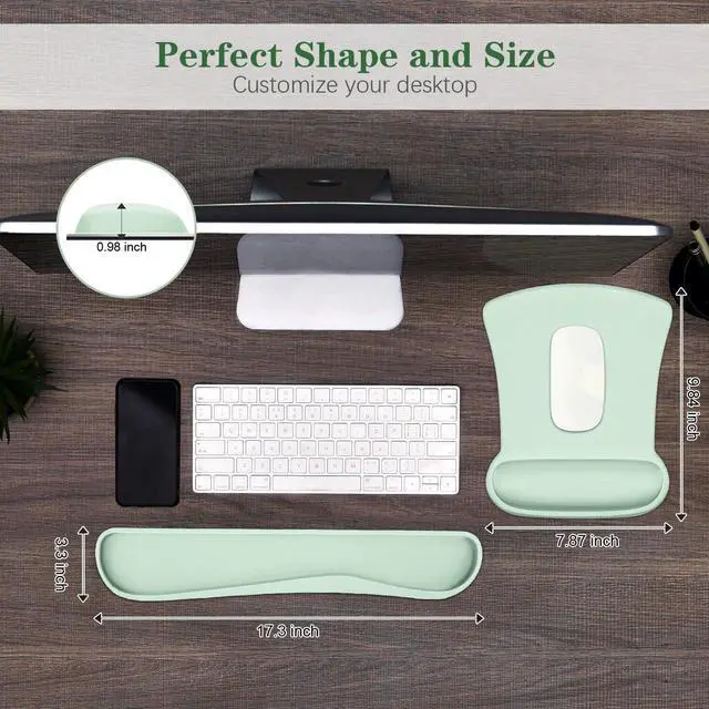 Large Mouse Pad size 9.84 x 7.87 x 0.98 inch and 17.3 x 3.3 x 0.98 inch keyboard wrist pad fits most computers notebooks or mouse and the same height keep your wrist always in a natural and comfortable stateWARRANTY: We provide perfect warranty and 24 hours customer service to solve your problems timely please rest assured not only a commitment but also practical action