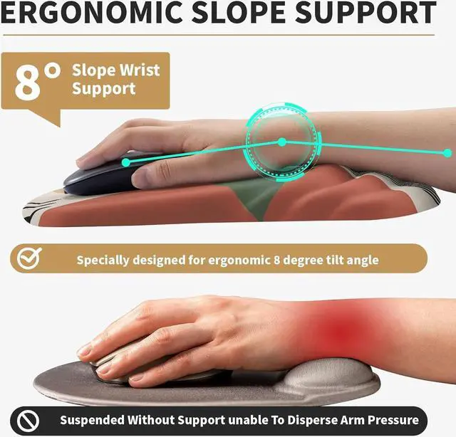 [Ergonomic Massage Design]: This innovative ergonomic mouse pad features an 8-degree slope and a massage contour design perfectly supporting the wrist and palm. The massage bumps effectively relieve wrist pain and fatigue improve carpal tunnel syndrome and enhance air circulation between the wrist and the mouse pad preventing sweating and keeping the wrist in the most comfortable position. It is the best choice for your desktop mouse pad.