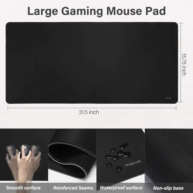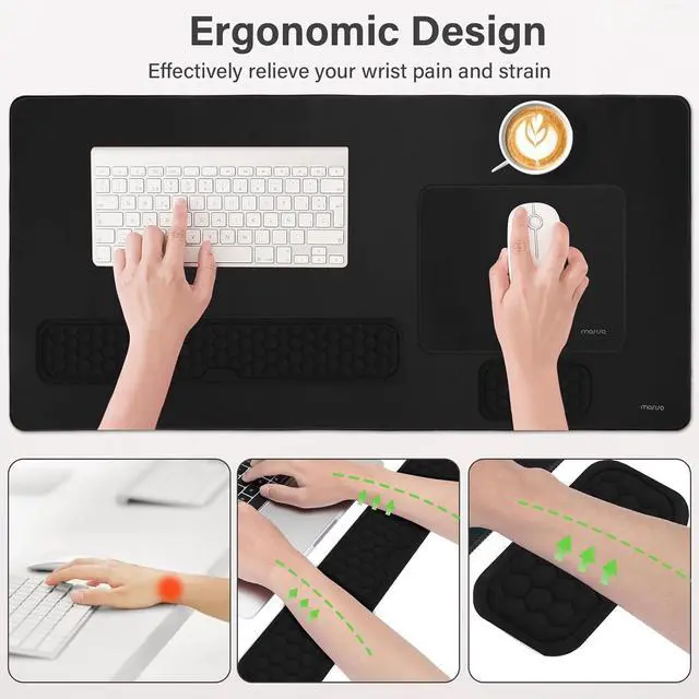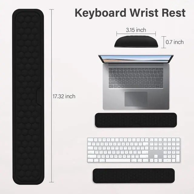 Dimension of large gaming mouse pad: 35.43 x 15.75 inch dimension of keyboard wrist rest: 17.32 x 3.15 inch dimension of square mousepad: 10 x 8.3 inch dimension of wrist rest support: 5.9 x 3.15 inch dimension of coaster: 3.9 inch (diameter). Fits all mouse/keyboard. Compatible with MacBook / Notebook / Chromebook / Ultrabook / Desktop / PC also compatible with iMac. Ergonomically designed with breathable and soft neoprene cloth and raised memory foam. Efficient for easy typing & pain relief. The filled memory foam cushion part will slowly rebound when leave it not easy to deform. The unique massage bead shape design on the keyboard wrist rest and wrist rest support offers soft support to relieve pressure and pain of your wrist keep your wrist in a natural and comfortable state. Non-slip base can firmly grasp the desk to prevent sliding or any unintentional movement. The comfortable design is that the mouse pad and wrist support are independently separated and the size of the mouse pad and wrist support is a very portable size easy to carry and can be put in the bag when traveling. One cup coaster is included to meet more your needs. The comfortable and smooth surface of the large gaming mouse pad can be used as a mouse pad desk mat and writing pad. The soft material makes it easy to roll up without wrinkles or creases.